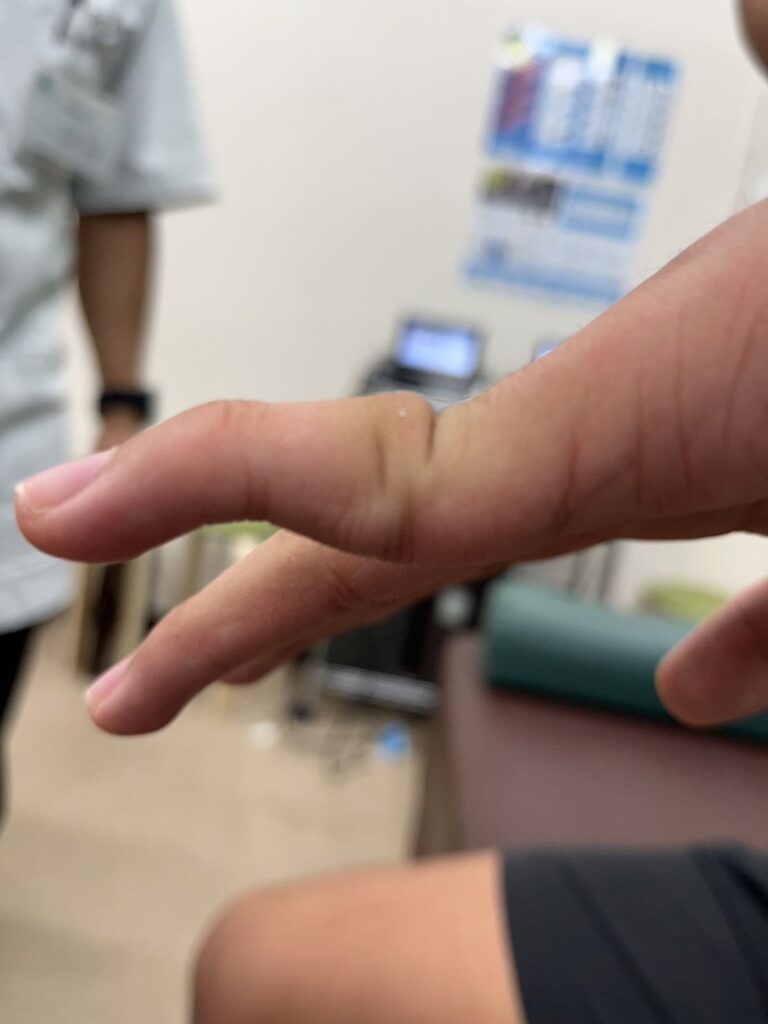 外観所見含めPIP関節背側脱臼と判断しその場で整復しました。