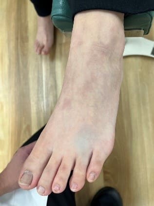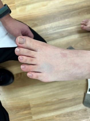 高校2年生女性 空手の練習中に足を払われた際に相手の足が指先にあたり負傷 初めはそのまま練習を続けていたが痛みがあったので足を確認したら指が曲がっていたとのこと。